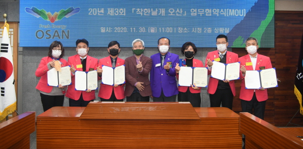 ¿À»ê½Ã°¡ 11¿ù 30ÀÏ ½Ãû »óȲ½Ç¿¡¼­ °ü³» ·ÎŸ¸®Å¬·´ 6°³¼Ò¿Í ¡®2020³â Á¦3ȸ ÂøÇѳ¯°³ ¿À»ê ¾÷¹« Çù¾à½Ä¡¯À» °¡Á³´Ù°í ¹àÇû´Ù.