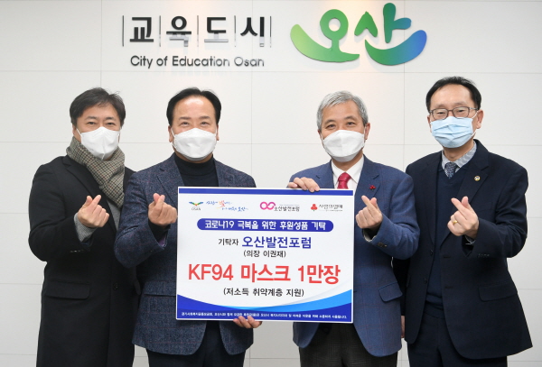 7ÀÏ ¿ÀÀü 10½Ã À̱ÇÀç ¿À»ê¹ßÀüÆ÷·³ÀÇÀåÀº ¿À»ê½Ãû ȸÀǽǿ¡¼­ °û»ó¿í ¿À»ê½ÃÀå¿¡°Ô ¸¶½ºÅ©¸¦ Àü´ÞÇϸç, ¡°¿ì¸® ¿À»êÀº Çѱ¹ÀüÀï Áß¿¡µµ Çб³¸¦ ¼¼¿ï Á¤µµ·Î ¾î·Á¿ï ¶§ ¼­·Î¸¦ µµ¿Ô´ø ½Ã¹ÎµéÀÌ´Ù. Áö±Ý Äڷγª·Î ÀÎÇØ ½Ã°£ÀÌ Áö³¯¼ö·Ï Ãë¾à°èÃþÀÇ °íÅëÀº °¡ÁßµÉ ¼ö¹Û¿¡ ¾ø´Ù. ÀÌ·² ¶§ ¹¹µç µµ¿ï ¼ö ÀÖ´Ù¸é µ½´Â °ÍÀÌ ÀÎÁö»óÁ¤ÀÌ´Ù¡±°í ¸»Çß´Ù.