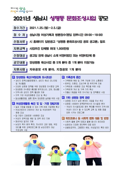 Âü¿©ÇÏ·Á¸é ¼º³²½Ã ȨÆäÀÌÁö(°í½Ã¡¤°ø°í)¿¡ ÀÖ´Â Áö¿ø½Åû¼, ¼ºÆòµî ¹®È Á¶¼º »ç¾÷ °èȹ¼ µîÀÇ ¼·ù¸¦ ÀÛ¼ºÇØ ±âÇÑ ³» ¼º³²½Ãû 6Ãþ ¿©¼º°¡Á·°ú¸¦ ¹æ¹® Á¢¼öÇØ¾ß ÇÑ´Ù.