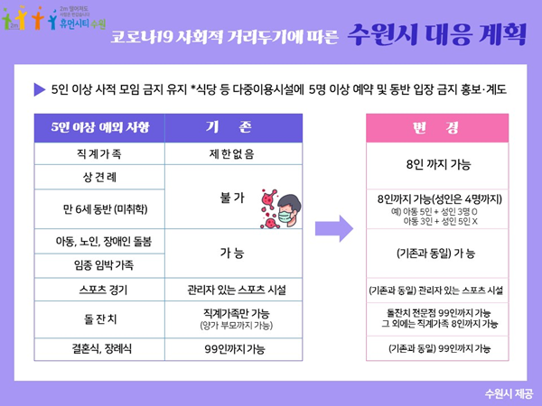¡®5ÀÎ ÀÌ»ó »çÀû ¸ðÀÓ ±ÝÁö¡¯´Â À¯ÁöµÈ´Ù. ´Ü Á÷°è°¡Á·À̰ųª »ó°ß·Ê¸¦ ÇÒ ¶§´Â 8ÀαîÁö ¸ðÀÏ ¼ö ÀÖ°í, ¸¸6¼¼ ÀÌÇÏ ¾ÆÀÌ µ¿¹Ý ¸ðÀÓÀº 8ÀαîÁö(´Ü ¼ºÀÎÀº 4¸í±îÁö) °¡´ÉÇÏ´Ù.