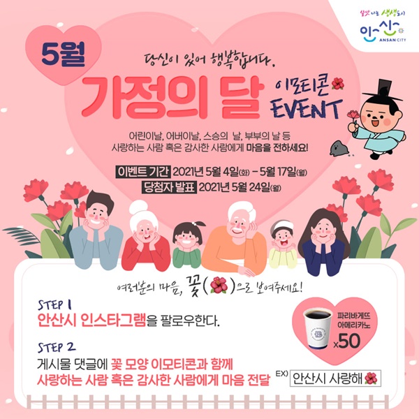 ¾È»ê½Ã´Â °¡Á¤ÀÇ ´ÞÀÎ 5¿ùÀ» ¸Â¾Æ ¿À´Â 17ÀϱîÁö ¾È»ê½Ã °ø½Ä ÀνºÅ¸±×·¥ ä³ÎÀ» Ȱ¿ëÇÑ À̸ðƼÄÜ À̺¥Æ®¸¦ ÁøÇàÇÑ´Ù°í 11ÀÏ ¹àÇû´Ù.