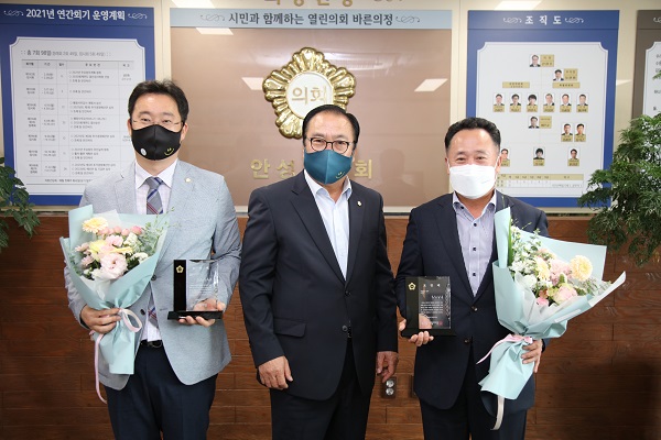 ¾È¼º½ÃÀÇȸ ¼Û¹ÌÂù ¿î¿µÀ§¿øÀå°ú À¯±¤Ã¶ ÀÇ¿øÀÌ Áö³­´Þ 25ÀÏ ¡®ÀÇÁ¤È°µ¿ ÃÖ¿ì¼öÀÇ¿ø¡¯À¸·Î ¼±Á¤µÆ´Ù.