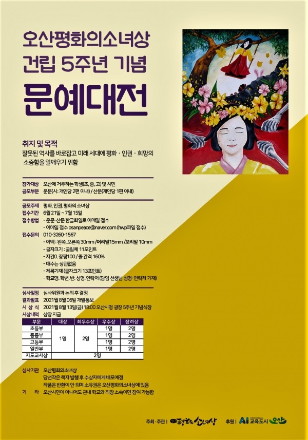 Á¢¼ö±â°£Àº 6¿ù 21ÀϺÎÅÍ 7¿ù 15ÀϱîÁöÀ̸ç À̸ÞÀÏ Á¢¼ö (osanpeace@naver.com)¸¦ ÅëÇØ ÀÀ¸ð °¡´ÉÇÏ´Ù. °ø¸ð ÀÛǰÀº Àü¹® ÀÛ°¡ÀÇ ÃÖÁ¾ ½É»ç¸¦ °ÅÃÄ 8¿ù 13ÀÏ ¿ÀÈÄ 6½Ã ¿À»ê½Ãû Á¤¹® ¿À»êÆòÈÀǼҳà»ó ¾Õ¿¡¼ °Ç¸³ 5Áֳ⠱â³ä½Ä ¶§ ´ë»ó¡¤ÃÖ¿ì¼ö»ó¡¤¿ì¼ö»ó¡¤Àå·Á»óÀ¸·Î ³ª´² ½Ã»óÇÒ ¿¹Á¤ÀÌ´Ù.