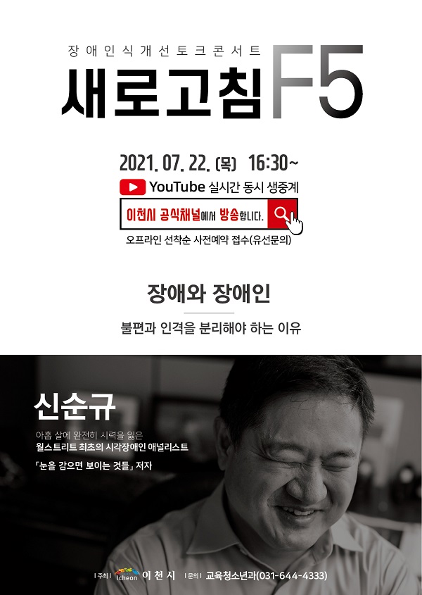 Àå¾ÖÀνݳ¼± ¡º»õ·Î°íħ(F5)¡»ÅäÅ©ÄܼƮ´Â ¿ÃÇØ ÀÌõ½Ã°¡ Àå¾ÖÀÎÆò»ýÇнÀµµ½Ã(±³À°ºÎ ÁÖ°ü)¿¡ ¼±Á¤µÇ¸é¼ ÇÔ²² ´õºÒ¾î »ì¾Æ°¡´Â »çȸ¸¦ À§ÇØ ±âȹÇÑ Çà»ç·Î <Àå¾Ö¿Í Àå¾ÖÀÎ – ºÒÆí°ú ÀΰÝÀ» ºÐ¸®ÇؾßÇÏ´ÂÀÌÀ¯> ¶ó´Â ÁÖÁ¦·Î ÁøÇàµÇ¸ç, 1±Þ ½Ã°¢Àå¾Ö¸¦ °¡Áö°í ÀÖ´Â ½Å¼ø±Ô¾¾¸¦ ÃʺùÇß´Ù.