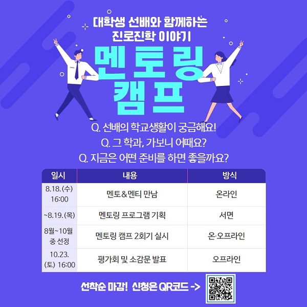 ¡®2021 ¸àÅ丵 Ä·ÇÁ¡¯´Â ¿Â¶óÀΰú ¿ÀÇÁ¶óÀÎÀ» È¥ÇÕÇÑ ¹æ½ÄÀ¸·Î ¿î¿µÇÏ¸ç »çÀü¸¸³², ¸àÅ丵 ÇÁ·Î±×·¥ ±âȹ, ¸àÅ丵 Ä·ÇÁ 2ȸ±â, Æò°¡È¸ µîÀ¸·Î ÇÁ·Î±×·¥À» ±¸¼ºÇØ »ý»ýÇÑ Áø·Î¡¤ÁøÇÐ Á¤º¸¿Í ÇаúŽ»ö ¹× ÇнÀÄÚĪÀ» ¹ÞÀ» ¼ö ÀÖ´Ù.