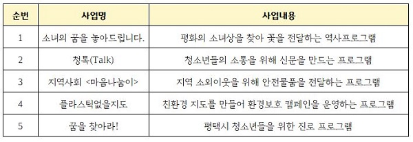 ÆòÅýà û¼Ò³âÂü¿©¿¹»êÁ¦´Â Áö¿ª»çȸ û¼Ò³âÀÌ ÇÊ¿äÇÑ »ç¾÷À» Á¦¾ÈÇÏ°í ¼±Á¤ÇØ ¿ì¼ö»ç¾÷À» Á÷Á¢ ¿î¿µÇϴ Ȱµ¿À¸·Î 6¿ù ¿Â¶óÀÎ ÅõÇ¥¸¦ ÅëÇØ 5°³ÀÇ ¿ì¼ö û¼Ò³â »ç¾÷À» ¼±¹ß ¿Ï·áÇß´Ù.