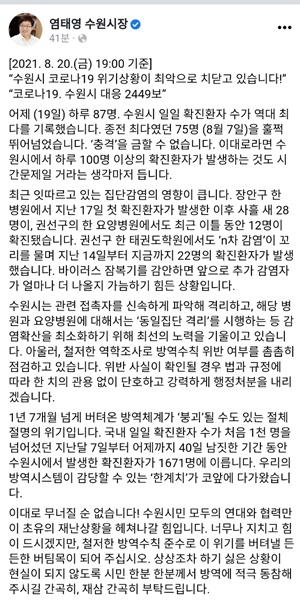 ¿°Å¿µ ½ÃÀåÀº 20ÀÏ °³ÀÎ SNS¿¡ ±ÛÀ» °Ô½ÃÇϰí, ¡°19ÀÏ ÇÏ·ç µ¿¾È Äڷγª19 È®ÁøÀÚ°¡ 87¸íÀÌ ¹ß»ýÇÏ´Â µî ¼ö¿ø½Ã Äڷγª19 À§±â »óȲÀÌ ÃÖ¾ÇÀ¸·Î Ä¡´Ý°í ÀÖ´Ù¡±¸ç ¡°Ã¶ÀúÇÑ ¿ªÇÐÁ¶»ç·Î ¹æ¿ª¼öÄ¢ À§¹ÝÀ» ÃÎÃÎÈ÷ Á¡°ËÇϰí, À§¹Ý »ç½ÇÀÌ È®ÀÎµÇ¸é ´ÜÈ£ÇÏ°Ô ÇàÁ¤Ã³ºÐÀ» ³»¸± °Í¡±À̶ó°í ¸»Çß´Ù.