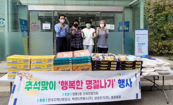 ¿µÅë2µ¿ ´ÜüÀåÀº Á÷Á¢ ´ë»ó°¡Á¤¿¡ ¹æ¹®ÇØ Ãß¼®¸íÀý¼±¹°¼¼Æ®¿Í ÈÄ¿ø¹°Ç°µéÀ» ÇÔ²² Àü´ÞÇÏ¸ç ´õ¿í dz¼ºÇÑ ¸íÀý³ª±â¸¦ ±â¿øÇß´Ù.