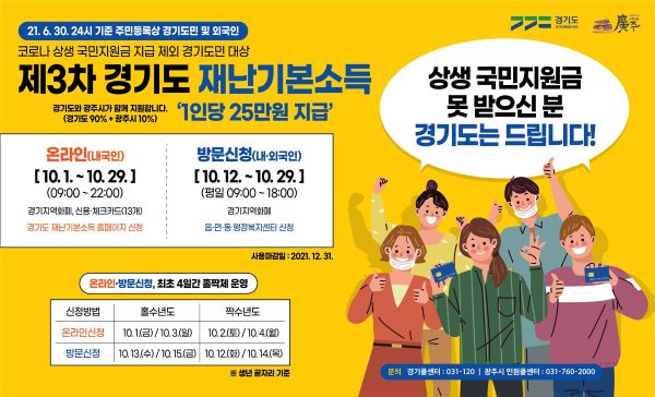 À̹ø Àç³­±âº»¼ÒµæÀº Áö±Þ¾×ÀÇ 90%´Â °æ±âµµ°¡, 10%´Â ±¤Áֽÿ¡¼­ ºÎ´ãÇϸç Áö±Þ´ë»óÀº 2021³â 6¿ù 30ÀÏ 24½Ã ÇöÀç °æ±âµµ³» °ÅÁÖÇϰí ÀÖ´Â ³»±¹ÀÎ ¹× ¿Ü±¹ÀÎÀ¸·Î ¿Ü±¹ÀÎÀº ¿µÁÖ±ÇÀÚ, °áÈ¥À̹ÎÀÚ µîÀÌ´Ù.