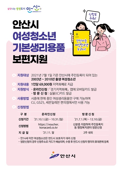 ¾È»ê½Ã´Â 10¿ù ÇÑ ´Þ°£ ¡®¿©¼ºÃ»¼Ò³â ±âº»»ý¸®¿ëǰ º¸ÆíÁö¿ø¡¯ 3Â÷ ¿Â¶óÀÎ Á¢¼ö¸¦ ÁøÇàÇÑ´Ù°í 4ÀÏ ¹àÇû´Ù.