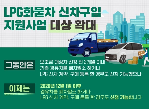 Áö¿ø ´ë»óÀº ¹èÃâ°¡½º µî±Þ°ú »ó°ü¾øÀÌ °æÀ¯Â÷¸¦ ÆóÂ÷(¼öÃâ ¸»¼Ò Á¦¿Ü)ÇÑ µÚ LPG 1t ȹ°Â÷¸¦ ½Å±Ô·Î »ç°íÀÚ ÇÏ´Â Â÷·® ¼ÒÀ¯ÀÚ ¶Ç´Â ±â°üÀ̸ç, Áö³ÇØ 12¿ù 1ÀÏ ÀÌÈÄ °æÀ¯Â÷ ÆóÂ÷ ¸»¼Ò, LPG ½ÅÂ÷°è¾à, ±¸¸Åµî·Ï µî 3°³ Áß 1°³ ÀÌ»ó ÇØ´çÇÏ¸é º¸Á¶±ÝÀ» ½ÅûÇÒ ¼ö ÀÖ´Ù.