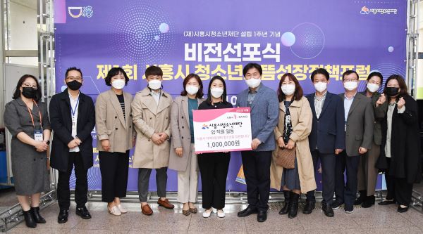 (Àç)½ÃÈï½Ãû¼Ò³âÀç´ÜÀº 10¿ù 16ÀÏ ½ÃÈï½Ãû¼Ò³â¼ö·Ã°ü¿¡¼ Áö¿ª¾Æµ¿¼¾ÅÍ Ã»¼Ò³âµéÀ» À§ÇÑ »ç¶ûÀÇ ÈÄ¿ø±Ý 1¹é¸¸ ¿øÀ» ½ÃÈï½Ã1%º¹ÁöÀç´Ü(ÀÌ»çÀå ¼º³«Çö)(ÀÌÇÏ¡®1%Àç´Ü¡¯)¿¡ ±âºÎÇÏ´Â Àü´Þ½ÄÀ» ¿¾ú´Ù.