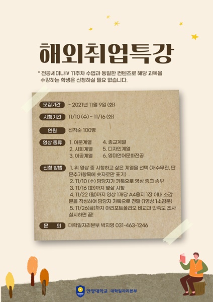 ¾È¾ç´ëÇб³ ´ëÇÐÀÏÀÚ¸®¼¾ÅÍ´Â ¿Á¤°ú ÀáÀç·ÂÀ» Áö´Ñ û³âµéÀÌ Á¦ÇÑµÈ ±¹³» Ãë¾÷½ÃÀå¿¡¼ ¹þ¾î³ª ÇØ¿Ü¿¡¼ ÀÏÀÚ¸®¸¦ ãÀ» ¼ö ÀÖµµ·Ï ¡®ÇØ¿ÜÃë¾÷Ư°¡¯À» ÁøÇàÇÑ´Ù°í ¹àÇû´Ù.