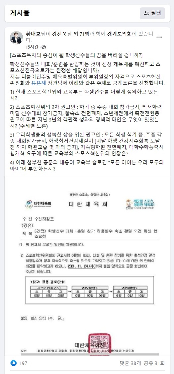 Ȳ´ëÈ£ ÀÇ¿ø¿¡ µû¸£¸é ´ëÇÑüÀ°È¸´Â Áö³ 19ÀÏ µµ³» °¡¸Í´Üüµé¿¡°Ô ½ºÆ÷Ã÷Çõ½ÅÀ§¿øÈ¸ÀÇ ±Ç°í»çÇ׿¡ °üÇÑ ÀǰßÀ» ¹¯´Â ±ä±Þ°ø¹®À» ¹ß¼ÛÇß´Ù.