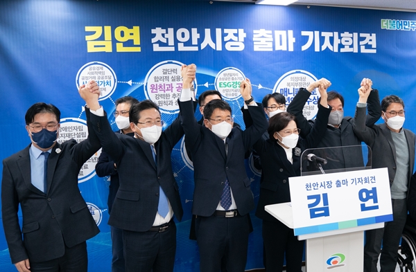 ±âÀÚȸ°ßÀå¿¡´Â ¹ÎÁÖ´ç ¼Ò¼Ó Ãµ¾È½ÃÀå È帱ºÀÎ À̱ÔÈñ Àü ±¹È¸ÀÇ¿ø, ÀÌÀç°ü Àü ´ëÀü½Ã ÇàÁ¤ºÎ½ÃÀå, ÀÌÁ¾´ã õ¾È½ÃÀÇ¿ø, Àå±â¼ö ´ëÅë·É¼Ò¼Ó ÀÚÄ¡ºÐ±ÇÀ§¿øÈ¸ Á¤Ã¥ÀÚ¹®À§¿ø, Ȳõ¼ø õ¾È½ÃÀÇȸ ÀÇÀåÀÌ Âü¼®ÇØ ´ëÅë·É ¼±°Å¿Í Áö¹æ¼±°Å¿¡¼ ¹ÎÁÖ´çÀÇ ¾Ð½ÂÀ» À§ÇØ ¶Ù°Ú´Ù´Â ÀÇÁö¸¦ º¸¿´´Ù.