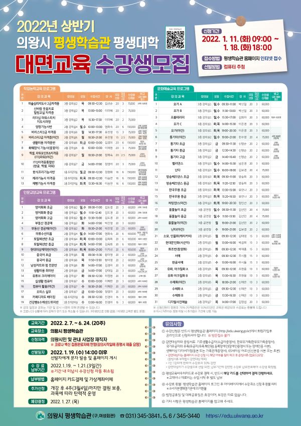 ±³À°½ÅûÀº 1¿ù 11ÀϺÎÅÍ 18ÀϱîÁö Àǿսà Æò»ýÇнÀ°ü(https://edu.uiwang.go.kr) ȨÆäÀÌÁö¸¦ ÅëÇØ Á¢¼ö¹Þ°í 1¿ù 19ÀÏ(¼ö) 14:00 ÄÄÇ»ÅÍÃß÷À» ÅëÇØ ¼ö°»ýÀ» ¼±¹ßÇÑ´Ù.