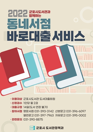 ¼ºñ½º ½ÅûÀº ±ºÆ÷½Ãµµ¼°ü ȨÆäÀÌÁö(www.gunpolib.go.kr)¸¦ ÅëÇØ ÇÒ ¼ö ÀÖÀ¸¸ç, ±ºÆ÷½Ãµµ¼°ü ´ëÃâȸ¿øÀ̸é 1ÀÎ´ç ¿ù 2±Ç±îÁö ½ÅûÀÌ °¡´ÉÇÏ°í ´ëÃ⠱ⰣÀº 14ÀÏÀÌ´Ù.