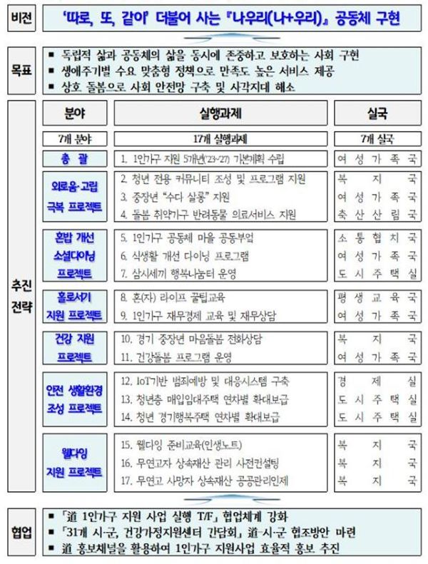 À̹ø ÃßÁø¾ÈÀº ¡®°æ±âµµ 1Àΰ¡±¸ÀÇ »çȸģȭ ÃËÁø ¹× Áö¿ø¿¡ °üÇÑ Á¶·Ê¡¯¿¡ µû¶ó ¿¬µµº° ¼¼¿ì´Â ½ÃÇà°èȹÀ¸·Î, ¡®µû·Î, ¶Ç, °°ÀÌ ´õºÒ¾î »ç´Â ³ª¿ì¸®(³ª+¿ì¸®) °øµ¿Ã¼ ±¸Çö¡¯À̶ó´Â ºñÀü ¾Æ·¡ ¡ãÃѰý ¡ã¿Ü·Î¿ò․°í¸³ ±Øº¹ ¡ãÈ¥¹ä°³¼± ¼Ò¼È´ÙÀÌ´× ¡ãȦ·Î¼­±â Áö¿ø ¡ã°Ç°­Áö¿ø ¡ã¾ÈÀü »ýȰȯ°æ Á¶¼º ¡ãÀ£´ÙÀ× Áö¿ø µî 7°³ ºÐ¾ß 17°³ °úÁ¦·Î ±¸¼ºµÆ´Ù.