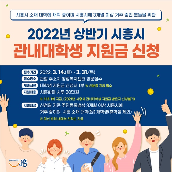 Áö³ÇØ Ã³À½ ½ÃÇàÇÑ °ü³» ´ëÇлý Áö¿ø±ÝÀº ½ÃÈï½Ã ¼ÒÀç ´ëÇÐ(¿ø)¿¡ ÀçÇÐ ÁßÀ̸ç, Áֹεî·Ï¹ý»ó ½ÃÈï½Ã¿¡ 3°³¿ù ÀÌ»ó °ÅÁÖ ÁßÀÎ ´ëÇлý(´ëÇпø»ý)ÀÌ¸é ´©±¸³ª ½ÅûÇÒ ¼ö ÀÖ´Ù. Áö¿ø±Ý 20¸¸ ¿øÀ» ½ÃÈïÈÆó ¡®½Ã·ç¡¯·Î ÃÖÃÊ 1ȸ¿¡ ÇÑÁ¤ÇØ Áö¿øÇÑ´Ù.