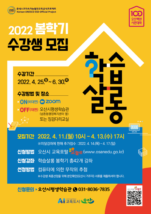 ÀÚ¼¼ÇÑ ³»¿ë È®Àΰú ¼ö°½ÅûÀº ¿À»ê½Ã ±³À°Æ÷ÅРȨÆäÀÌÁö ¿À´Ãe(www.osanedu.go.kr)¸¦ ÅëÇØ¼ °¡´ÉÇÏ´Ù.