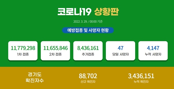3¿ù 29ÀÏ 0½Ã ±âÁØ °æ±âµµÀÇ ÃÑ ´©Àû È®ÁøÀÚ¼ö´Â 3,436,151¸íÀ¸·Î °¢Áö¿ªº° ½Å±ÔÈ®ÁøÀÚ ¹ß»ýÇöȲÀº ´ÙÀ½°ú °°´Ù.(ÇØ¿ÜÀ¯ÀÔ Æ÷ÇÔ)