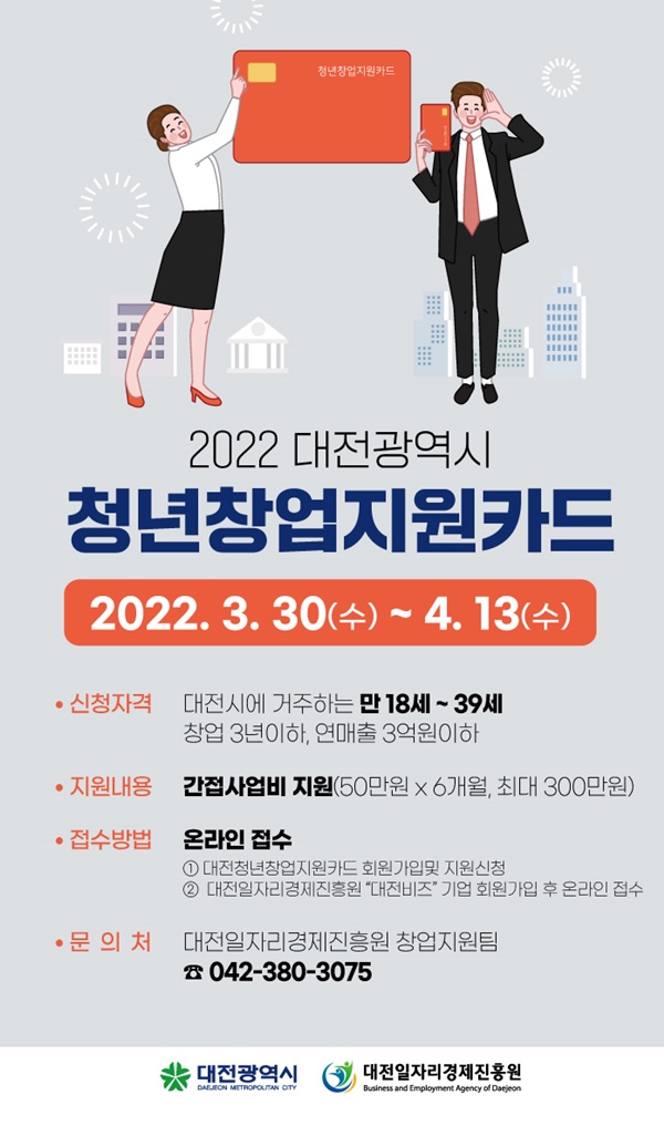 ½ÅûÀº 3¿ù 30ÀϺÎÅÍ 4¿ù 13ÀϱîÁö ´ëÀüû³ââ¾÷Áö¿øÄ«µå(www.djstart.or.kr)¿Í ´ëÀü±¤¿ª½Ã Áß¼Ò±â¾÷ Áö¿øÆ÷ÅÐ ´ëÀüºñÁî(www.djbea.or.kr/biz) ¾ç »çÀÌÆ®¿¡¼ ¸ðµÎ ¿Â¶óÀÎ ½ÅûÀ» ÇØ¾ß ÃÖÁ¾Á¢¼ö·Î ÀÎÁ¤µÈ´Ù.