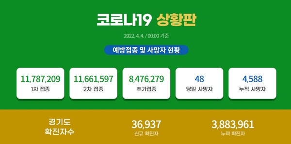 4¿ù 4ÀÏ 0½Ã ±âÁØ °æ±âµµÀÇ ÃÑ ´©Àû È®ÁøÀÚ¼ö´Â 3,883,961¸íÀ¸·Î °¢Áö¿ªº° ½Å±ÔÈ®ÁøÀÚ ¹ß»ýÇöȲÀº ´ÙÀ½°ú °°´Ù.(ÇØ¿ÜÀ¯ÀÔ Æ÷ÇÔ)