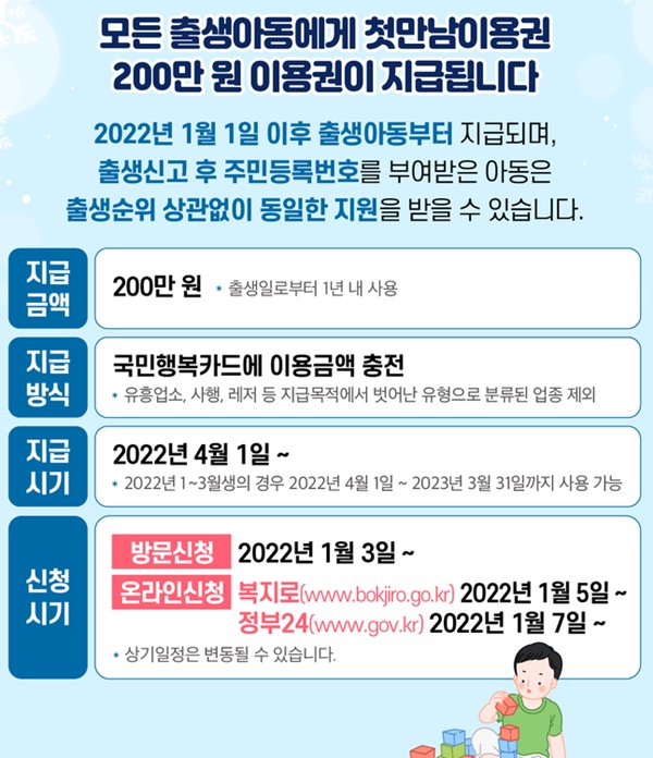 ¿µ¾Æ±â ÁýÁßÅõÀÚ »ç¾÷ÀÇ ÀÏȯÀ¸·Î ¿Ã óÀ½ ½ÃÇàµÇ´Â ÀÌ¿ë±ÇÀº ±âÁ¸ ¹ß±Þ¹ÞÀº ±¹¹ÎÇູīµå¿¡ 200¸¸ ¿ø Æ÷ÀÎÆ®°¡ Áö±ÞµÇ´Â °ÍÀ¸·Î, 2022³â 1¿ù 1ÀÏ ÀÌÈÄ Ãâ»ýÇÑ ¾Æµ¿À̶ó¸é ´©±¸³ª ÇØ´ç µ¿Áֹμ¾ÅÍ ¹× ¿Â¶óÀÎÀ» ÅëÇØ ½Åû °¡´ÉÇÏ´Ù.