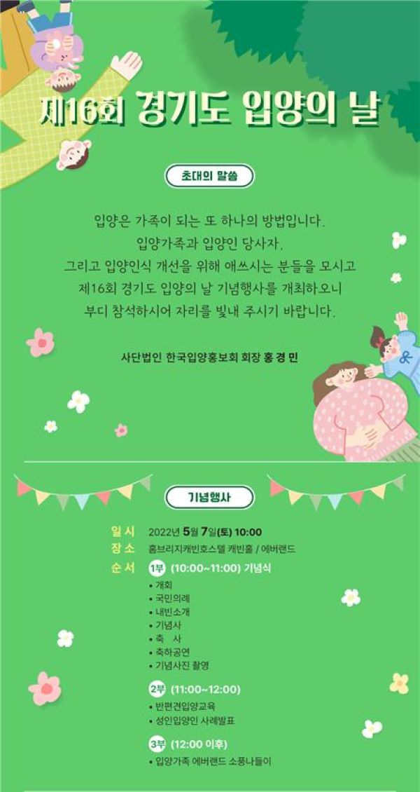 ÀÔ¾çÀÇ ³¯ 5¿ù 11ÀÏÀº °ÇÀüÇÑ ÀÔ¾ç¹®È Á¤Âø°ú ±¹³» ÀÔ¾ç Ȱ¼ºÈ¸¦ À§ÇØ Á¦Á¤µÈ ¹ýÁ¤±â³äÀÏ·Î ¡®°¡Á¤ÀÇ ´Þ 5¿ù¿¡ ÇÑ °¡Á¤(1)ÀÌ ÇѾÆÀÌ(1)¸¦ ÀÔ¾çÇØ °¡Á¤À» ÀÌ·é´Ù¡¯´Â Àǹ̴Ù. ÀԾ簡Á· ¸ðÀÓÀÇ ÆíÀǸ¦ À§ÇØ 5¿ù 7ÀÏ ÁÖ¸»¿¡ Çà»ç¸¦ °³ÃÖÇÏ°Ô µÆ´Ù.