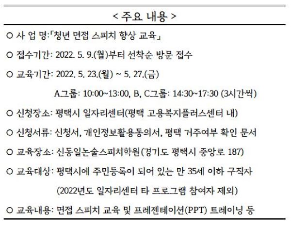 ÆòÅýà ÀÏÀÚ¸®¼¾ÅÍ´Â °ü³» û³âÃþ ´ë»ó ±¸Á÷Àڵ鿡°Ô ¸éÁ¢¿¡ ´ëÇÑ µÎ·Á¿òÀ» ¾ø¾Ö°í, ½ÇÁ¦ ¸éÁ¢Àå¿¡¼ ÀÚ½ÅÀÇ ÀǰßÀ» ³í¸®ÀûÀ̰í È¿°úÀûÀ¸·Î Àü´ÞÇÒ ¼ö ÀÖµµ·Ï ¸éÁ¢ ½ºÇÇÄ¡ Çâ»ó ±³À°À» ½Ç½ÃÇÑ´Ù.