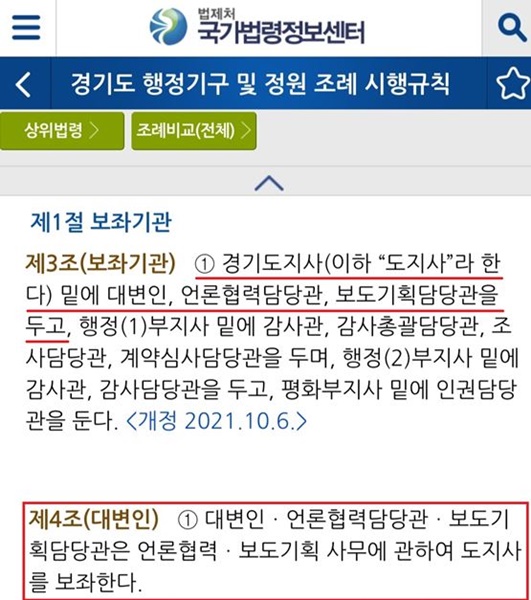 ÀÌ·¯ÇÑ ÁöÀûÀÇ ¹è°æÀ¸·Î´Â °æ±âµµ ÇàÁ¤±â±¸ ¹× Á¤¿ø Á¶·Ê ½ÃÇà±ÔÄ¢ Á¦4Á¶¨çÇ׿¡ ÀÇÇÏ¸é ¡¯´ëº¯ÀΤý¾ð·ÐÇù·Â´ã´ç°ü¤ýº¸µµ±âȹ´ã´ç°üÀº ¾ð·ÐÇù·Â¤ýº¸µµ±âȹ »ç¹«¿¡ °üÇÏ¿© µµÁö»ç¸¦ º¸ÁÂÇÑ´Ù.¡® ·Î ±ÔÁ¤ÇÏ¸é¼ ¾ð·ÐÇù·Â´ã´ç°ü°ú º¸µµ±âȹ´ã´ç°ü¿¡ ´ëÇØ¼´Â ¾÷¹«ºÐÀå ³»¿ëÀ» ÀÚ¼¼ÇÏ°Ô ¸í±âÇÏ¿´À¸³ª ´ëº¯ÀÎÀ̳ª ´ëº¯Àνǰú °ü·ÃÇØ¼´Â ÀüÇô ±ÔÁ¤µÇ¾î ÀÖÁö ¾Ê±â ¶§¹®ÀÌ´Ù.
