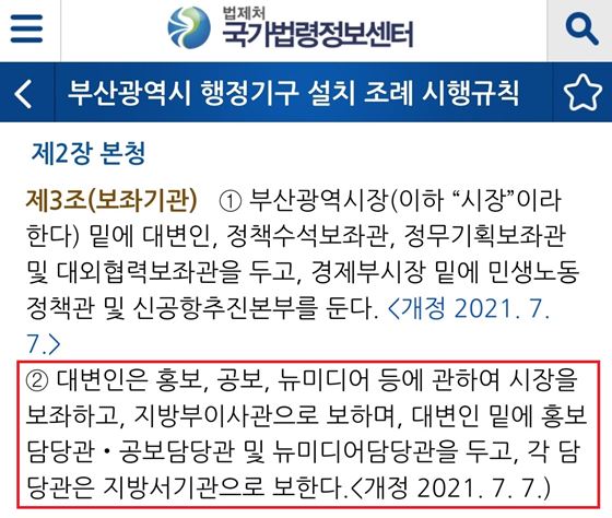 ¶ÇÇÑ ºÎ»ê±¤¿ª½ÃÀÇ °æ¿ì¿¡µµ ºÎ»ê±¤¿ª½Ã ÇàÁ¤±â±¸ ¼³Ä¡ Á¶·Ê ½ÃÇà±ÔÄ¢ Á¦3Á¶ ¨èÇ׿¡ ¡®´ëº¯ÀÎÀº È«º¸, °øº¸, ´º¹Ìµð¾î µî¿¡ °üÇÏ¿© ½ÃÀåÀ» º¸ÁÂÇϰí, Áö¹æºÎÀÌ»ç°üÀ¸·Î º¸Çϸç, ´ëº¯ÀÎ ¹Ø¿¡ È«º¸´ã´ç°ü‧°øº¸´ã´ç°ü ¹× ´º¹Ìµð¾î´ã´ç°üÀ» µÎ°í, °¢ ´ã´ç°üÀº Áö¹æ¼±â°üÀ¸·Î º¸ÇÑ´Ù.¡¯·Î Á÷Á¦»ó ¼Ò¼Ó°ü°è¿Í °³·«ÀûÀÎ ¾÷¹«ºÐÀåÀÌ Á¤ÇØÁ® ÀÖ´Ù´Â °ÍÀÌ´Ù.