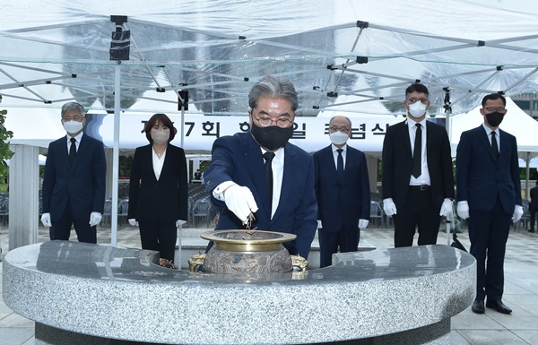 ÀÌÀçÁ¤ °æ±âµµ±³À°°¨ÀÌ Á¦67ȸ ÇöÃæÀÏÀÎ 6ÀÏ Á÷¿øµé°ú ÇÔ²² ¼ö¿ø ÇöÃæÅ¾À» ã¾Æ ¼ø±¹¼±¿°ú È£±¹¿µ·É, ¹ÎÁÖ¿»çÀÇ Èñ»ý°ú Çå½ÅÀ» ±â·È´Ù.
