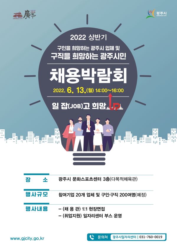 ±¤Áֽô ¿À´Â 13ÀÏ ¿ÀÈÄ 2½ÃºÎÅÍ 4½Ã±îÁö ±¤Áֽà ¹®È½ºÆ÷Ã÷¼¾ÅÍ 3Ãþ ´Ù¸ñÀûüÀ°°ü¿¡¼ ¡®ÀÏ Àâ(JOB)°í Èñ¸Á UP!¡¯ ±¤Áֽà ä¿ë¹Ú¶÷ȸ¸¦ °³ÃÖÇÑ´Ù°í 7ÀÏ ¹àÇû´Ù.