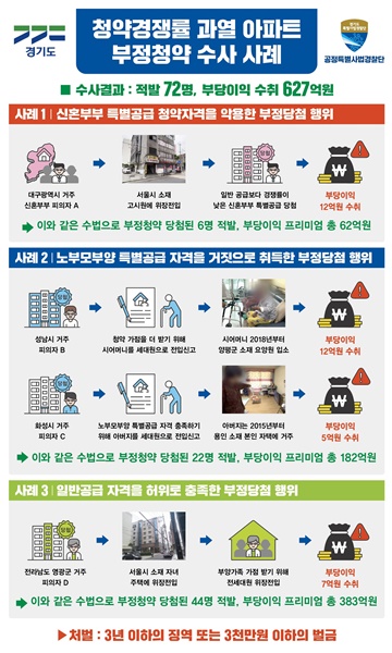 ±è¿µ¼ö °æ±âµµ °øÁ¤Æ¯º°»ç¹ý°æÂû´ÜÀåÀº 15ÀÏ °æ±âµµÃ»¿¡¼ ±âÀÚȸ°ßÀ» ¿°í ¡°È¼º µ¿Åº2½Åµµ½Ã¿Í ¼ö¿ø ±¤±³½Åµµ½Ã¿¡¼ ºÐ¾çÇÑ Ã»¾à°æÀï·ü °ú¿ ¾ÆÆÄÆ® 3°³ ´ÜÁö(µ¿Åº2 µð¿¡Æ®¸£ ÆÛ½ºÆ¼Áö¡¤µ¿Åº2 Á¦ÀÏdz°æÃ¤ ÆÛ½ºÆ¼¾î¡¤±¤±³ Èú½ºÅ×ÀÌÆ® ±¤±³Áß¾Ó¿ª ÆÛ½ºÆ®)¿¡ ´ëÇØ ¿ÃÇØ 3¿ùºÎÅÍ ¼ö»ç¸¦ ½Ç½ÃÇÑ °á°ú Ưº°°ø±Þ µî û¾à ÀÚ°ÝÀ» °ÅÁþÀ¸·Î ÃëµæÇØ ´ç÷µÈ ºÎÁ¤Ã»¾àÀÚ 72¸íÀ» Àû¹ßÇß´Ù¡±°í ¹àÇû´Ù.