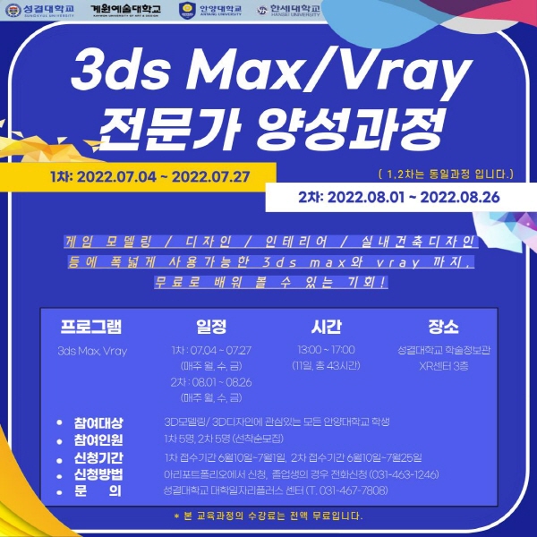 ¾È¾ç´ëÇб³ ´ëÇÐÀÏÀÚ¸®Ç÷¯½º¼¾ÅÍ´Â '3ds Max/Vray Àü¹®°¡ ¾ç¼º°úÁ¤ ÇÁ·Î±×·¥À»' 1, 2Â÷·Î ³ª´©¾î 7¿ù 4ÀϺÎÅÍ ÁøÇàÇÑ´Ù°í ¹àÇû´Ù.