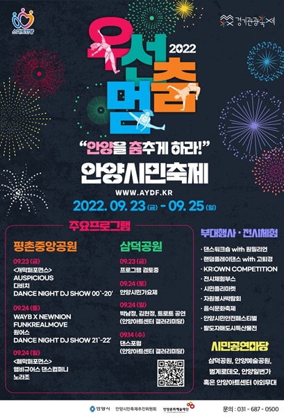 ¿À´Â 9¿ù 23ÀϺÎÅÍ 25ÀϱîÁö »çÈê°£ ¾È¾ç½Ã ÆòÃÌÁß¾Ó°ø¿ø°ú »ï´ö°ø¿ø¿¡¼ ¿¸®´Â 2022 ¾È¾ç½Ã¹ÎÃàÁ¦ <¿ì¼±¸Ø¡®Ã㡯>Àº Áö³ 2000³â ù ȸ¸¦ ½ÃÀÛÀ¸·Î ¸Å³â 30¸¸¿© ¸íÀÇ °ü¶÷°´ÀÌ Ã£´Â ¾È¾ç½ÃÀÇ ´ëÇ¥ »ýȰ¹®È ¿¹¼ú Âü¿©Çü ÃàÁ¦ÀÌ´Ù.