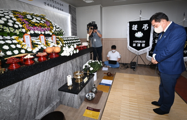 À̳¯ ¿ÀÈÄ 1½Ã 55ºÐ ºó¼Ò¸¦ ãÀº ÀÌÀçÁØ ½ÃÀåÀº ¿øºÒ±³ °æÀα³±¸°¡ °ÅÇàÇÑ Ã߸ð ÀǽĿ¡ 30¿© ºÐ µ¿¾È Âü¿©ÇÏ¸ç ¼¼ ¸ð³àÀÇ ³ÌÀ» À§·ÎÇϸç, ¡°¼¼ ¸ð³à°¡ ¼ö¿ø½Ã¿¡¼ Èû°ã°Ô »ì¾Æ°¡½Ã´Ù°¡ µ¹¾Æ°¡¼Ì´Âµ¥, µ¹ºÁµå¸®Áö ¸øÇØ Á˼ÛÇÑ ¸¶À½À¸·Î ¿Ô´Ù¡±°í ¸»Çß´Ù.