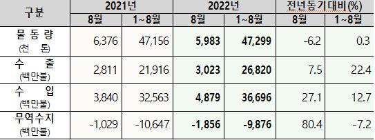 8¿ù ÆòÅÃÇ× ¹ÝÃâÀÔ ¹°µ¿·® ¹× ¼öÃâÀÔ ÇöȲÀ» Áý°èÇÑ °á°ú(ÀáÁ¤), ¹°µ¿·®Àº Àü³â µ¿±â´ëºñ 6.2% °¨¼ÒÇÑ 5,983õ ÅæÀ̸ç, ±Ý¾×±âÁØ ¼öÃâ¾×Àº 7.5% Áõ°¡ÇÑ 30.2¾ï ºÒ, ¼öÀÔ¾×Àº 27.1% Áõ°¡ÇÑ 48.8¾ï ºÒ, ¹«¿ª¼öÁö´Â ¾à 18.6¾ï ºÒ ÀûÀÚ·Î ³ªÅ¸³µ´Ù.