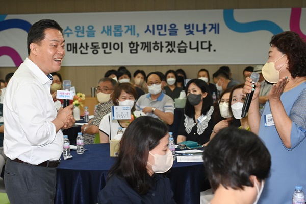 ÀÌÀçÁØ ¼ö¿øÆ¯·Ê½ÃÀåÀº ¹Î¼±8±â Ãâ¹ü ÀÌÈÄ ½Ã¹Îµé°úÀÇ ¼ÒÅë¿¡ ¹æÁ¡À» µ×´Ù. ´ëÇ¥ÀûÀÎ »ç¾÷ÀÌ ¡®½Ã¹ÎÀÌ ²Þ²Ù´Â ¼ö¿øÀ̾߱⡯´Ù. ½ÃÀåÀÌ ÃëÀÓ Á÷ÈÄ ¼ö¿øÁö¿ª 4°³ ±¸¿Í 44°³ µ¿ ÁֹεéÀ» Á÷Á¢ ¸¸³ª ´ëÈÇÏ´Â ÀÚ¸®¸¦ ¸¶·ÃÇß´Ù. 7¿ù7ÀϺÎÅÍ 10¿ù12ÀϱîÁö 100ÀÏ¿¡ °¡±î¿î ±â°£ µ¿¾È ÃÑ 4õ260¸íÀÌ Âü¿©Çß´Ù. ÁÖ¿ä Âü¼®ÀÚ´Â ±¸¿Í µ¿¿¡¼ Ȱµ¿ÇÏ´Â °¢Á¾ ÁֹδÜü¿Í Áö¿ª»çȸÀÇ ÁÖ¿ä ±¸¼º¿ä¼Ò°¡ µÇ´Â Çб³¡¤±â°ü¡¤´ÜüÀÇ ´ëÇ¥, ÁֹδëÇ¥ µî ¡®¿ì¸®µ¿³×¡¯¸¦ »ì¾Æ°¡´Â ÁÖ¹ÎÀ̾ú´Ù. ÀÌ ÀÚ¸®¿¡¼ ½ÃÀå°ú ½Ã¹ÎµéÀº Á÷Á¢ ´«À» ¸ÂÃ߸ç Àλ縦 ³ª´©°í »õ·Î¿î ½ÃÁ¤ ±¸»óÀ» ¼³¸íÇÑ °ÍÀº ¹°·Ð, ½Ã¹ÎµéÀÌ ÁøÂ¥ ¿øÇÏ´Â »ç¾÷ÀÌ ¹«¾ùÀÎÁö °¡°¨¾ø´Â ´ëȸ¦ À̾´Ù.
