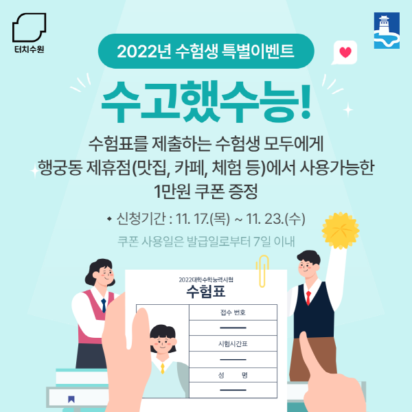 15ÀÏ ¼ö¿ø½Ã°¡ ¡®ÅÍÄ¡¼ö¿ø¡¯¸¦ Ȱ¿ëÇØ ´ëÇмöÇдɷ½ÃÇè ¼öÇè»ýµéÀ» À§ÇÑ Æ¯º°À̺¥Æ® ¡®¼ö°íÇß¼ö´É!¡¯À» ÁøÇàÇÑ´Ù°í ¹àÇû´Ù.