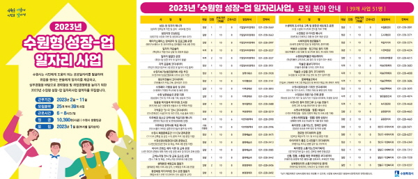 4ÀÏ ¼ö¿ø½Ã´Â ¡®2023³â ¼ö¿øÇü ¼ºÀå-¾÷ ÀÏÀÚ¸®»ç¾÷¡¯¿¡ Âü¿©ÇÒ ±¸Á÷ÀÚ 51¸íÀ» 1¿ù Áß¿¡ ¸ðÁýÇÑ´Ù°í ¹àÇû´Ù.