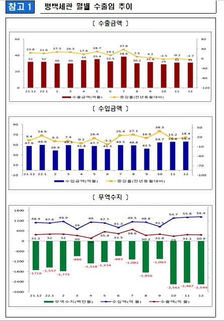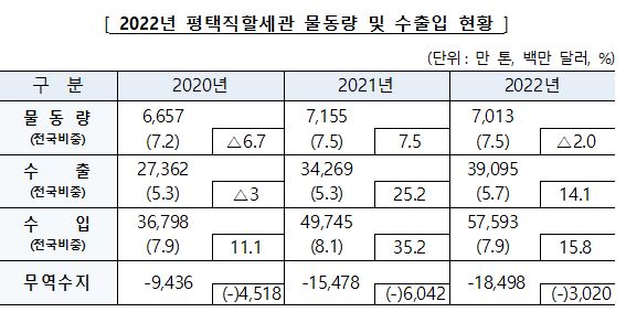 ¤· 2022³â ÆòÅü¼°üÀ» ÅëÇÑ ¼öÃâ¾×Àº 391¾ï ´Þ·¯·Î Àü³â´ëºñ 14.1% Áõ°¡ÇÏ¿´À¸¸ç, ¼öÀÔ¾×Àº 576¾ï ´Þ·¯·Î Àü³â ´ëºñ 18.4% Áõ°¡ÇÏ¿© ¹«¿ª¼öÁö´Â 185¾ï ´Þ·¯ ÀûÀÚ¸¦ ±â·ÏÇß´Ù.