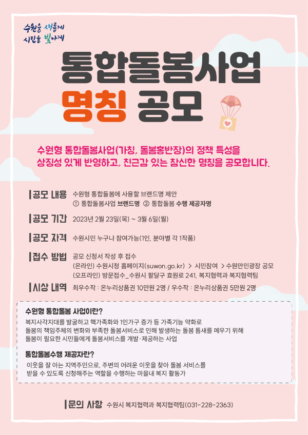 ¼ö¿ø½Ã, ÅëÇÕµ¹º½»ç¾÷ÀÇ »õ·Î¿î ¸íĪ ã´Â ½Ã¹Î °ø¸ð ÁøÇàÇÑ´Ù -¡®ÅëÇÕµ¹º½»ç¾÷¡¯,¡®ÅëÇÕµ¹º½¼öÇà Á¦°øÀÚ¡¯¸íĪ °ø¸ð |