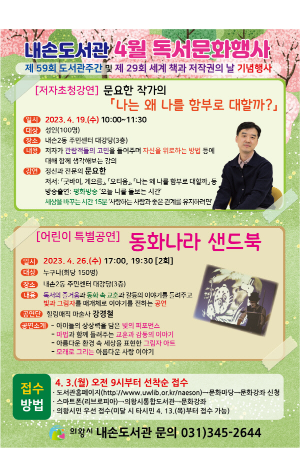 ÇÑÆí, 4¿ù µ¶¼¹®ÈÇà»ç´Â 4¿ù 3ÀÏ ¿ù¿äÀÏ 9½ÃºÎÅÍ ³»¼Õµµ¼°ü ȨÆäÀÌÁö ¹× ¸®ºê·ÎÇǾÆ(¾Û)¸¦ ÅëÇØ ¼±Âø¼øÀ¸·Î ½ÅûÇÒ ¼ö ÀÖÀ¸¸ç, °ü·ÃµÈ ÀÚ¼¼ÇÑ »çÇ×Àº ³»¼Õµµ¼°ü(¢Ï031-345-2644)À¸·Î ¹®ÀÇÇÏ¸é ¾È³»¹ÞÀ» ¼ö ÀÖ´Ù.