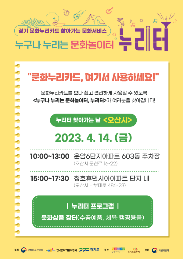 ¿À»ê½Ã´Â ¿À´Â 15ÀÏ °æ±â¹®ÈÀç´Ü°ú Çù¾÷ÇØ ¹®È´©¸®Ä«µå °¡¸ÍÁ¡ ¹æ¹®¿¡ ¾î·Á¿òÀ» °Þ´Â ÀÌ¿ëÀÚ°¡ ÀÖ´Â °÷À¸·Î Á÷Á¢ ã¾Æ°¡ ¹®È¼ºñ½º¸¦ Á¦°øÇϱâ À§ÇØ Ã£¾Æ°¡´Â ¹®È¼ºñ½ºÀÎ ¡®´©¸®ÅÍ¡¯¸¦ ´ë¿øµ¿ Áö¿ª¿¡¼ ¿î¿µÇÑ´Ù°í 11ÀÏ ¹àÇû´Ù.