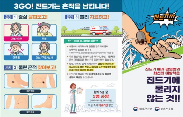 ÆòÅú¸°Ç¼Ò °ü°èÀÚ´Â ¡°SFTS´Â ¿¹¹æ¹é½Å°ú Ä¡·áÁ¦°¡ µû·Î ¾ø¾î Áøµå±â¿¡ ¹°¸®Áö ¾Ê´Â °ÍÀÌ ÃÖ¼±ÀÇ ¿¹¹æ¹ý¡±À̶ó°í °Á¶Çϸç, ¡°¾ß¿Ü Ȱµ¿ ÈÄ 2ÁÖ ³» Áõ»óÀÌ ¹ß»ýÇÑ´Ù¸é Áï½Ã ÀÇ·á±â°üÀ» ¹æ¹®ÇÏ¿© ³óÀÛ¾÷ ¶Ç´Â ¾ß¿ÜȰµ¿·ÂÀ» ¾Ë·Á¾ß ÇÑ´Ù¡±°í ÀüÇß´Ù.