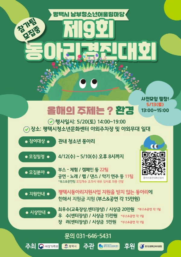 Âü°¡ÆÀ ¸ðÁý ±â°£Àº 5¿ù 10ÀÏ(¼ö) ¿ÀÈÄ 8½Ã±îÁöÀ̸ç, ½ÅûÀ» ¿øÇϴ û¼Ò³â µ¿¾Æ¸®´Â Æ÷½ºÅÍ¿¡ ³ª¿Í ÀÖ´Â QRÄÚµå·Î Á¢¼ÓÇÏ¿© ½ÅûÇÒ ¼ö ÀÖ´Ù. µ¿¾Æ¸®°æÁø´ëȸ¿Í °ü·ÃÇÑ ÀÚ¼¼ÇÑ ³»¿ëÀº Æ÷½ºÅÍ ¶Ç´Â ¹®È¼¾ÅÍ ´©¸®Áý(www.ptycc.kr) °øÁö »çÇ׿¡¼ È®ÀÎÀÌ °¡´ÉÇÏ´Ù.