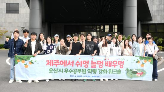 À̱ÇÀç ¿À»ê½ÃÀåÀº »ó¹Ý±â ¿ì¼ö °ø¹«¿øÀ¸·Î ¼±Á¤µÈ °ø¹«¿øµéÀ» µ¶·ÁÇϸç, À̹ø ¿öÅ©¼óÀ» ÅëÇØ ½Ã¹Îµé¿¡°Ô ´õ ³ªÀº ÇàÁ¤ ¼ºñ½º¸¦ Á¦°øÇÒ ¼ö ÀÖµµ·Ï Èû½á´Þ¶ó°í ´çºÎÇß½À´Ï´Ù.
