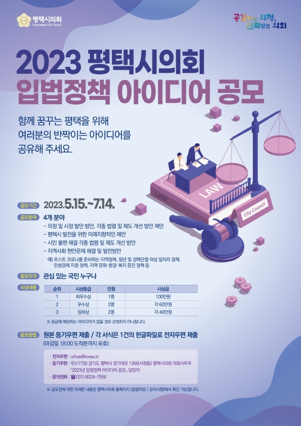ÆòÅýÃÀÇȸ, ¡®2023³â ÀÔ¹ýÁ¤Ã¥ ¾ÆÀ̵ð¾î °ø¸ð¡¯½Ç½Ã -5¿ù 15ÀÏ~7¿ù 14ÀÏ 2°³¿ù°£ ¡®2023³â ÆòÅýÃÀÇȸ ÀÔ¹ýÁ¤Ã¥ ¾ÆÀ̵ð¾î °ø¸ð' ½Ç½Ã |